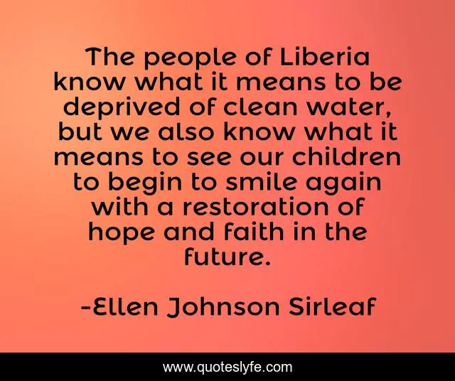 This page presents the quote "The people of Liberia know what it means to be deprived of clean water, but we also know what it means to see our children to begin to smile again with a restoration of hope and faith in the future.". Author of this quote is Ellen Johnson Sirleaf. This quote is about smile, future, children, happiness,.