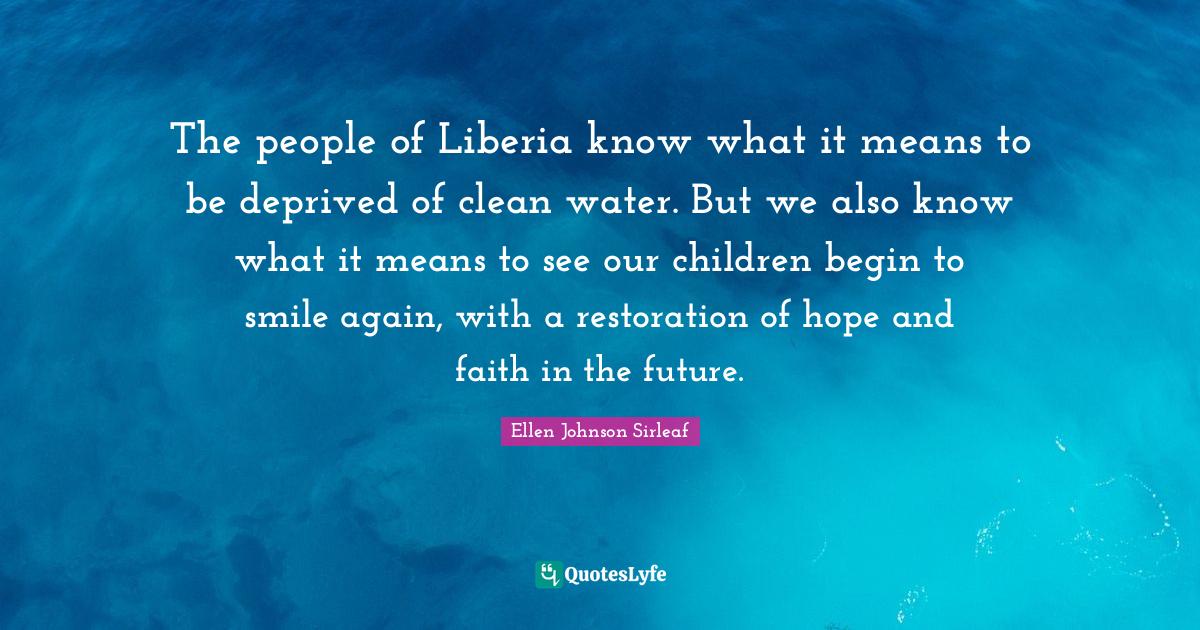 This page presents the quote "The people of Liberia know what it means to be deprived of clean water. But we also know what it means to see our children begin to smile again, with a restoration of hope and faith in the future.". Author of this quote is Ellen Johnson Sirleaf. This quote is about clean water, deprived, future, restoration, people, smile, mean, hope and faith, children,.
