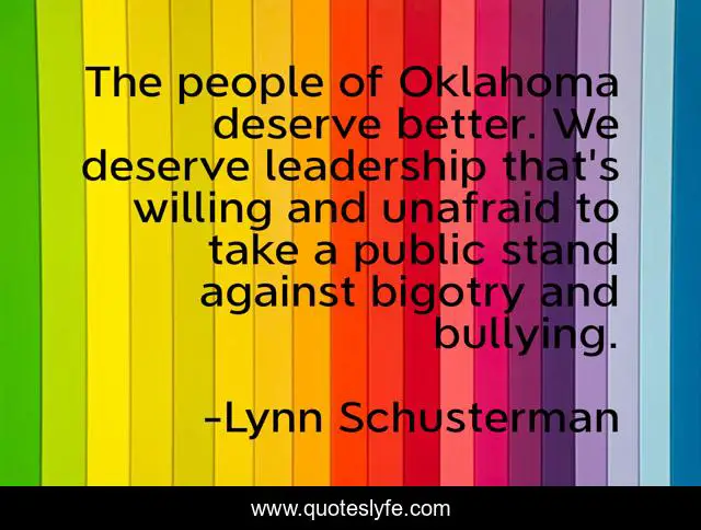 This page presents the quote "The people of Oklahoma deserve better. We deserve leadership that's willing and unafraid to take a public stand against bigotry and bullying.". Author of this quote is Lynn Schusterman. This quote is about bullying, better, people,.