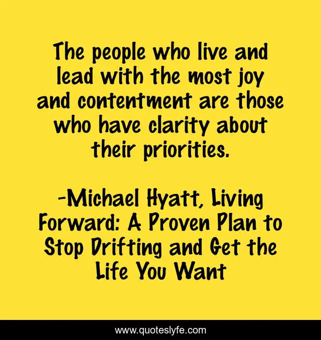 This page presents the quote "The people who live and lead with the most joy and contentment are those who have clarity about their priorities.". Author of this quote is Michael Hyatt, Living Forward: A Proven Plan to Stop Drifting and Get the Life You Want. This quote is about personal-development, intentional-living, priorities, life-plan,.