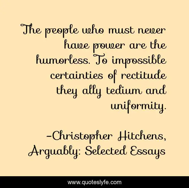 This page presents the quote "The people who must never have power are the humorless. To impossible certainties of rectitude they ally tedium and uniformity.". Author of this quote is Christopher Hitchens, Arguably: Selected Essays. This quote is about tyranny, totalitarianism, humor, power,.