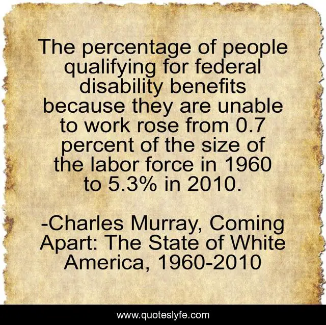 This page presents the quote "The percentage of people qualifying for federal disability benefits because they are unable to work rose from 0.7 percent of the size of the labor force in 1960 to 5.3% in 2010.". Author of this quote is Charles Murray, Coming Apart: The State of White America, 1960-2010. This quote is about motivation, welfare-state, unemployment, work, calling, vocation,.