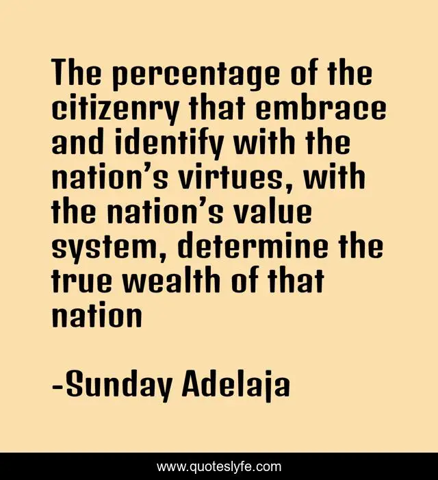 This page presents the quote "The percentage of the citizenry that embrace and identify with the nation’s virtues, with the nation’s value system, determine the true wealth of that nation". Author of this quote is Sunday Adelaja. This quote is about system, citizenry, virtues, nation, identify, determine, embrace, percentage, true,.
