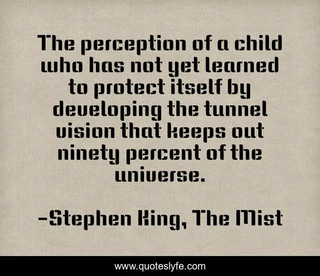This page presents the quote "The perception of a child who has not yet learned to protect itself by developing the tunnel vision that keeps out ninety percent of the universe.". Author of this quote is Stephen King, The Mist. This quote is about the-mist, defense-mechanisms, childhood, vision, stephen-king,.