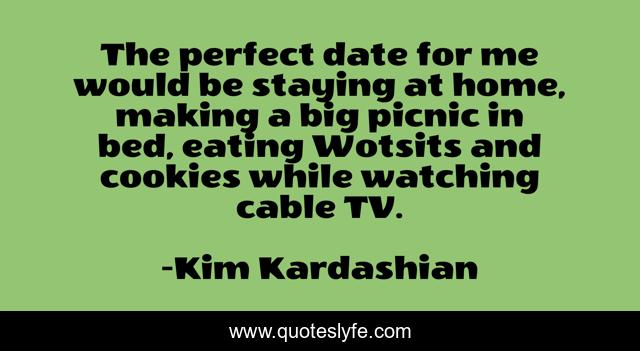 This page presents the quote "The perfect date for me would be staying at home, making a big picnic in bed, eating Wotsits and cookies while watching cable TV.". Author of this quote is Kim Kardashian. This quote is about me, perfect, eating,.