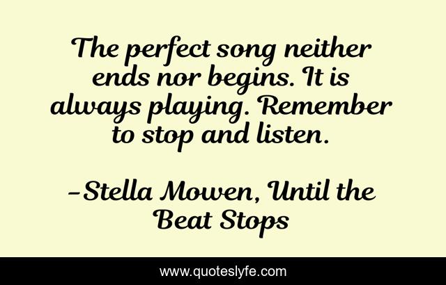 This page presents the quote "The perfect song neither ends nor begins. It is always playing. Remember to stop and listen.". Author of this quote is Stella Mowen, Until the Beat Stops. This quote is about philosophy, art, life-lessons, song, creation, writing, inspirational, enthusiasm,.