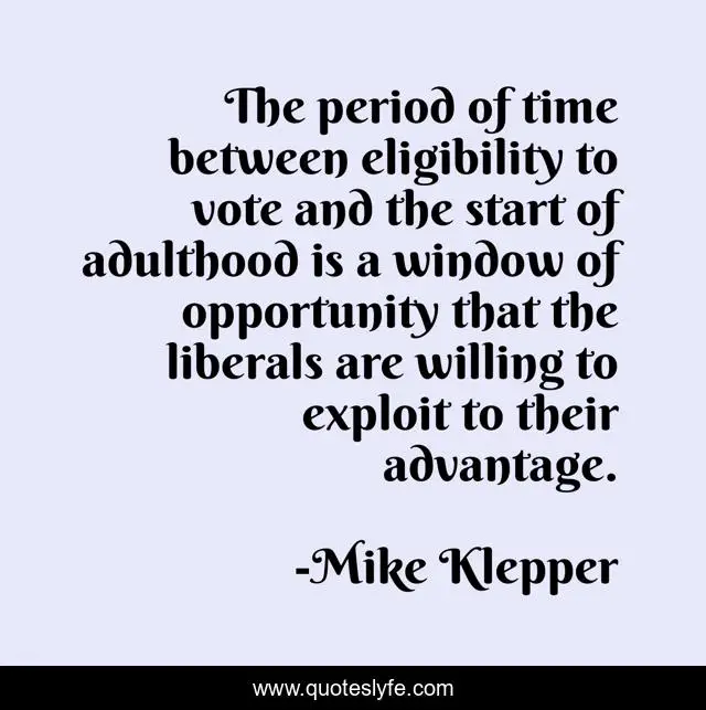 This page presents the quote "The period of time between eligibility to vote and the start of adulthood is a window of opportunity that the liberals are willing to exploit to their advantage.". Author of this quote is Mike Klepper. This quote is about adulthood, exploitation, maturity, voting, opportunity, liberalism,.