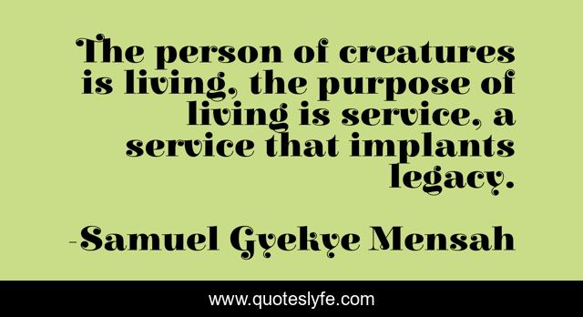 This page presents the quote "The person of creatures is living, the purpose of living is service, a service that implants legacy.". Author of this quote is Samuel Gyekye Mensah. This quote is about enthusiasm, leadership, inspirational, service, power-of-thoughts,.