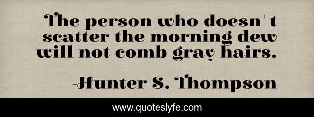 This page presents the quote "The person who doesn't scatter the morning dew will not comb gray hairs.". Author of this quote is Hunter S. Thompson. This quote is about person, gray,.
