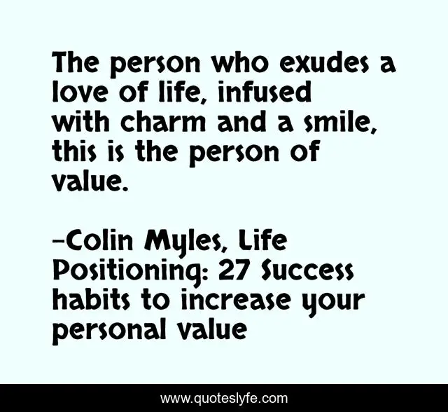 This page presents the quote "The person who exudes a love of life, infused with charm and a smile, this is the person of value.". Author of this quote is Colin Myles, Life Positioning: 27 Success habits to increase your personal value. This quote is about values-in-life, value,.