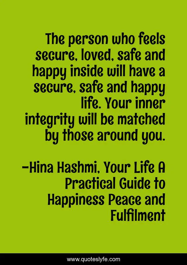 This page presents the quote "The person who feels secure, loved, safe and happy inside will have a secure, safe and happy life. Your inner integrity will be matched by those around you.". Author of this quote is Hina Hashmi, Your Life A Practical Guide to Happiness Peace and Fulfilment. This quote is about integrity, love, happiness, affection,.
