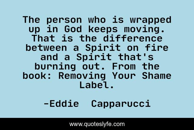This page presents the quote "The person who is wrapped up in God keeps moving. That is the difference between a Spirit on fire and a Spirit that's burning out. From the book: Removing Your Shame Label.". Author of this quote is Eddie Capparucci. This quote is about perseverance, holy-spirit, growth, spiritual-growth,.