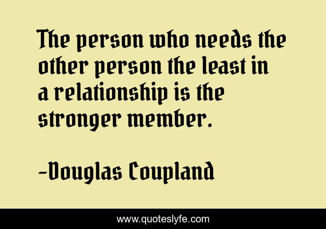 This page presents the quote "The person who needs the other person the least in a relationship is the stronger member.". Author of this quote is Douglas Coupland. This quote is about person, needs, stronger,.