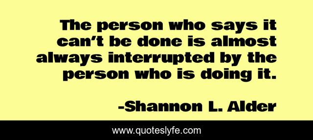 This page presents the quote "The person who says it can’t be done is almost always interrupted by the person who is doing it.". Author of this quote is Shannon L. Alder. This quote is about perserverance, living, planner, not-giving-up, choices, planning, goals, action, doing-it,.