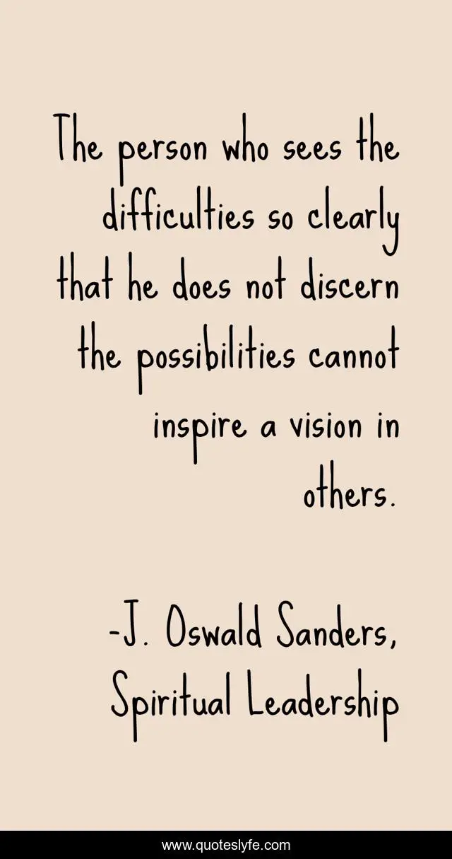This page presents the quote "The person who sees the difficulties so clearly that he does not discern the possibilities cannot inspire a vision in others.". Author of this quote is J. Oswald Sanders, Spiritual Leadership. This quote is about leadership, vision,.
