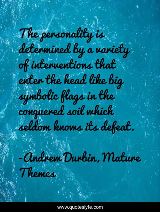 This page presents the quote "The personality is determined by a variety of interventions that enter the head like big symbolic flags in the conquered soil which seldom knows its defeat.". Author of this quote is Andrew Durbin, Mature Themes. .
