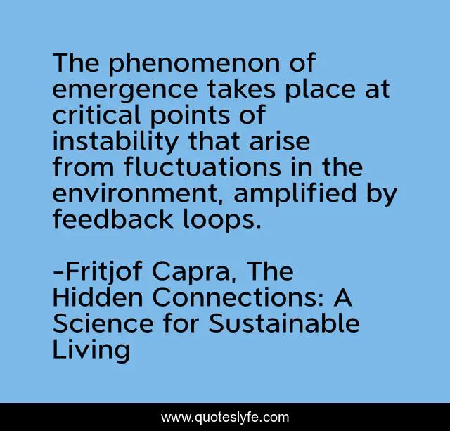 This page presents the quote "The phenomenon of emergence takes place at critical points of instability that arise from fluctuations in the environment, amplified by feedback loops.". Author of this quote is Fritjof Capra, The Hidden Connections: A Science for Sustainable Living. .