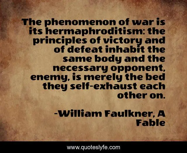 "William Faulkner, A Fable Quotes." Quoteslyfe.com, 2025. Fri. 05 Dec. 2025. <https://www.quoteslyfe.com/quote/The-phenomenon-of-war-is-its-hermaphroditism-52134>.