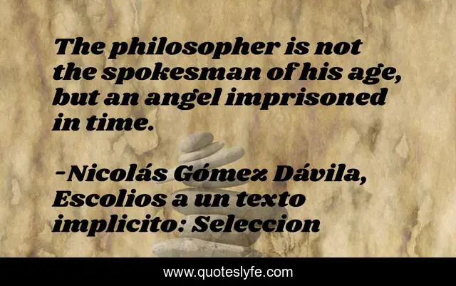 This page presents the quote "The philosopher is not the spokesman of his age, but an angel imprisoned in time.". Author of this quote is Nicolás Gómez Dávila, Escolios a un texto implicito: Seleccion. This quote is about philosophy, angel, philosopher, time,.