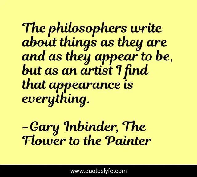 This page presents the quote "The philosophers write about things as they are and as they appear to be, but as an artist I find that appearance is everything.". Author of this quote is Gary Inbinder, The Flower to the Painter. This quote is about philosophy, art, artist,.