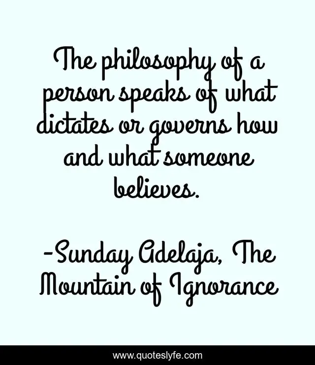 This page presents the quote "The philosophy of a person speaks of what dictates or governs how and what someone believes.". Author of this quote is Sunday Adelaja, The Mountain of Ignorance. This quote is about danger, mountain, life, darkness, power, government, god, philosophy, people,.