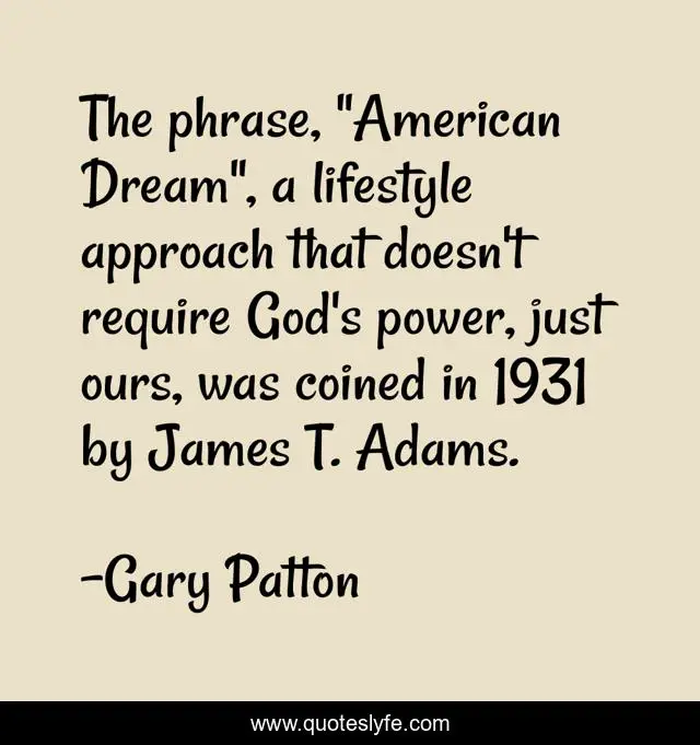 This page presents the quote "The phrase, "American Dream", a lifestyle approach that doesn't require God's power, just ours, was coined in 1931 by James T. Adams.". Author of this quote is Gary Patton. This quote is about empowerment, lifestyle, american-dream, jesus,.