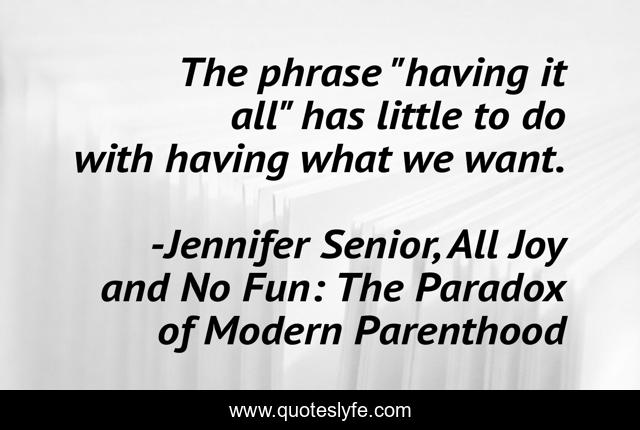 This page presents the quote "The phrase "having it all" has little to do with having what we want.". Author of this quote is Jennifer Senior, All Joy and No Fun: The Paradox of Modern Parenthood. This quote is about distraction, indecision, focus,.