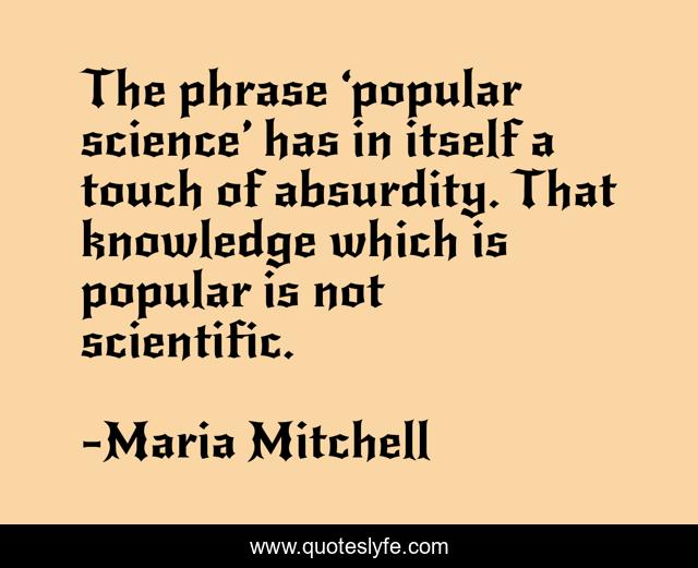 This page presents the quote "The phrase ‘popular science’ has in itself a touch of absurdity. That knowledge which is popular is not scientific.". Author of this quote is Maria Mitchell. This quote is about science, absurd, knowledge,.