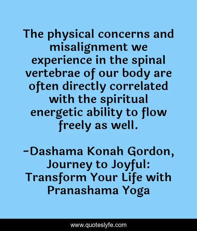 This page presents the quote "The physical concerns and misalignment we experience in the spinal vertebrae of our body are often directly correlated with the spiritual energetic ability to flow freely as well.". Author of this quote is Dashama Konah Gordon, Journey to Joyful: Transform Your Life with Pranashama Yoga. This quote is about love, happiness, inspirational, enthusiasm, yoga, affection,.