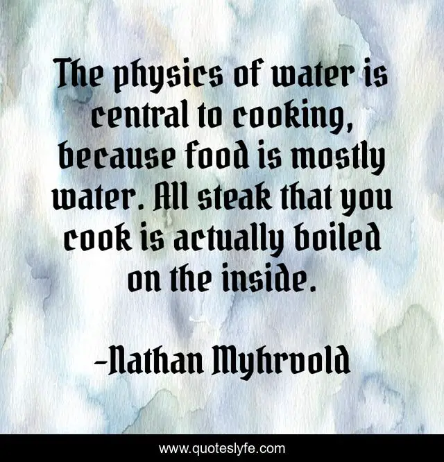 This page presents the quote "The physics of water is central to cooking, because food is mostly water. All steak that you cook is actually boiled on the inside.". Author of this quote is Nathan Myhrvold. This quote is about water, cooking,.