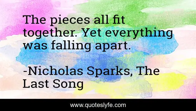This page presents the quote "The pieces all fit together. Yet everything was falling apart.". Author of this quote is Nicholas Sparks, The Last Song. .