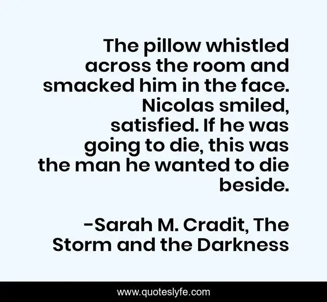 This page presents the quote "The pillow whistled across the room and smacked him in the face. Nicolas smiled, satisfied. If he was going to die, this was the man he wanted to die beside.". Author of this quote is Sarah M. Cradit, The Storm and the Darkness. This quote is about frienship, humor, danger,.