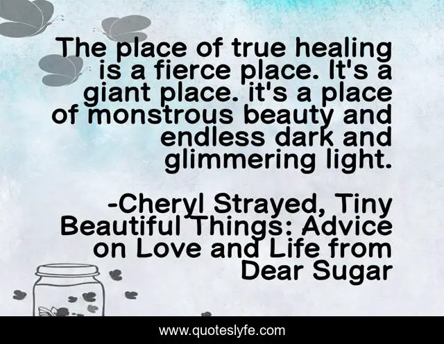This page presents the quote "The place of true healing is a fierce place. It's a giant place. it's a place of monstrous beauty and endless dark and glimmering light.". Author of this quote is Cheryl Strayed, Tiny Beautiful Things: Advice on Love and Life from Dear Sugar. This quote is about life-lessons, life, healing, recovering,.