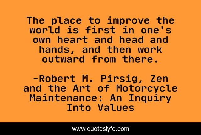 This page presents the quote "The place to improve the world is first in one's own heart and head and hands, and then work outward from there.". Author of this quote is Robert M. Pirsig, Zen and the Art of Motorcycle Maintenance: An Inquiry Into Values. This quote is about enthusiasm, inspirational,.