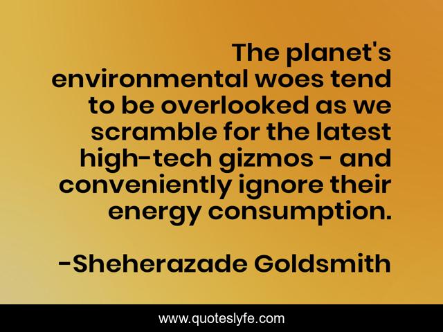 This page presents the quote "The planet's environmental woes tend to be overlooked as we scramble for the latest high-tech gizmos - and conveniently ignore their energy consumption.". Author of this quote is Sheherazade Goldsmith. This quote is about ignore, energy, consumption,.