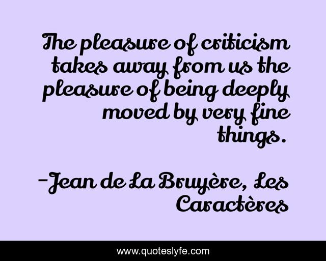 This page presents the quote "The pleasure of criticism takes away from us the pleasure of being deeply moved by very fine things.". Author of this quote is Jean de La Bruyère, Les Caractères. .