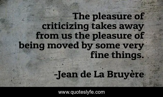This page presents the quote "The pleasure of criticizing takes away from us the pleasure of being moved by some very fine things.". Author of this quote is Jean de La Bruyère. This quote is about criticism, critique, happiness, pleasure,.