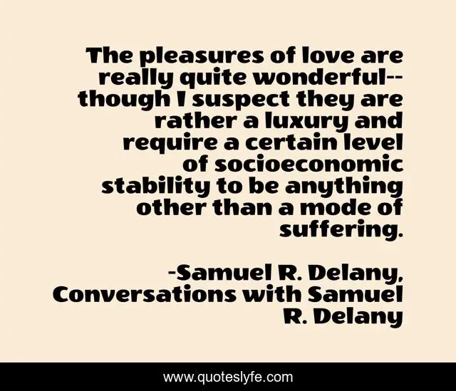 This page presents the quote "The pleasures of love are really quite wonderful--though I suspect they are rather a luxury and require a certain level of socioeconomic stability to be anything other than a mode of suffering.". Author of this quote is Samuel R. Delany, Conversations with Samuel R. Delany. This quote is about suffering, love, class, affection,.