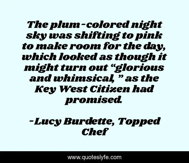 This page presents the quote "The plum-colored night sky was shifting to pink to make room for the day, which looked as though it might turn out “glorious and whimsical, ” as the Key West Citizen had promised.". Author of this quote is Lucy Burdette, Topped Chef. This quote is about mystery, foodie, key-west,.