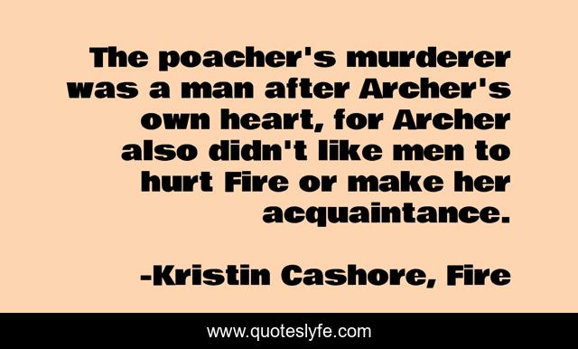 This page presents the quote "The poacher's murderer was a man after Archer's own heart, for Archer also didn't like men to hurt Fire or make her acquaintance.". Author of this quote is Kristin Cashore, Fire. This quote is about humor, jealousy,.