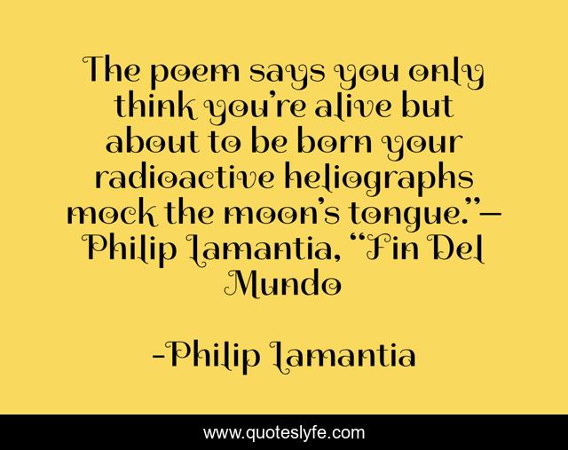 This page presents the quote "The poem says you only think you’re alive but about to be born your radioactive heliographs mock the moon’s tongue.”— Philip Lamantia, “Fin Del Mundo". Author of this quote is Philip Lamantia. .