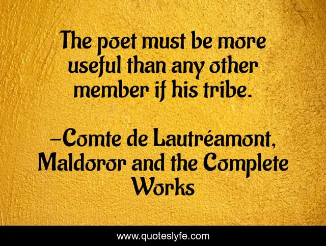This page presents the quote "The poet must be more useful than any other member if his tribe.". Author of this quote is Comte de Lautréamont, Maldoror and the Complete Works. This quote is about duty, poets, poetry,.