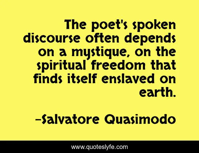 This page presents the quote "The poet's spoken discourse often depends on a mystique, on the spiritual freedom that finds itself enslaved on earth.". Author of this quote is Salvatore Quasimodo. This quote is about earth, spiritual, discourse,.