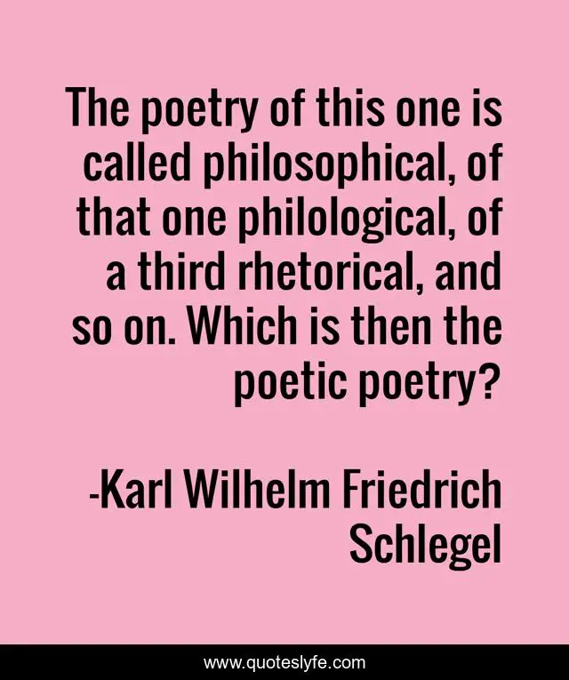 This page presents the quote "The poetry of this one is called philosophical, of that one philological, of a third rhetorical, and so on. Which is then the poetic poetry?". Author of this quote is Karl Wilhelm Friedrich Schlegel. This quote is about rhetorical, third, which,.