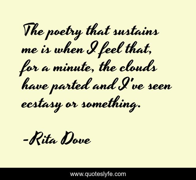 This page presents the quote "The poetry that sustains me is when I feel that, for a minute, the clouds have parted and I've seen ecstasy or something.". Author of this quote is Rita Dove. This quote is about me, feel, clouds,.