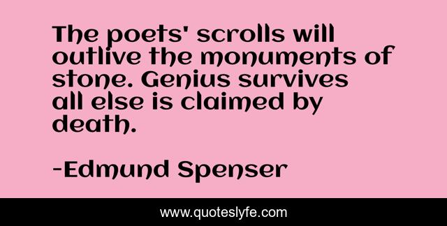 This page presents the quote "The poets' scrolls will outlive the monuments of stone. Genius survives all else is claimed by death.". Author of this quote is Edmund Spenser. This quote is about genius, stone, monuments,.