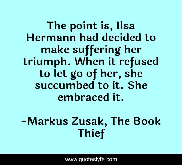 This page presents the quote "The point is, Ilsa Hermann had decided to make suffering her triumph. When it refused to let go of her, she succumbed to it. She embraced it.". Author of this quote is Markus Zusak, The Book Thief. This quote is about saddness, suffering, triumph,.