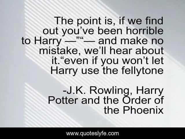 This page presents the quote "The point is, if we find out you’ve been horrible to Harry —”“— and make no mistake, we’ll hear about it.“even if you won’t let Harry use the fellytone". Author of this quote is J.K. Rowling, Harry Potter and the Order of the Phoenix. This quote is about arthur-weasley, lupin, tonks, dursley, hilarious,.