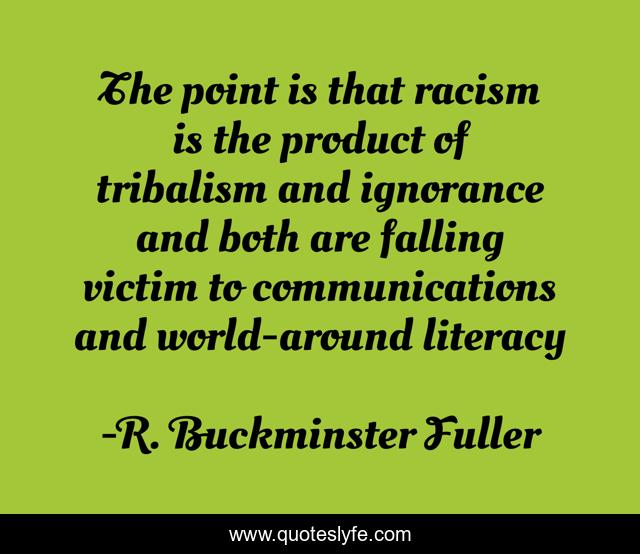 This page presents the quote "The point is that racism is the product of tribalism and ignorance and both are falling victim to communications and world-around literacy". Author of this quote is R. Buckminster Fuller. This quote is about communication, peace, race,.