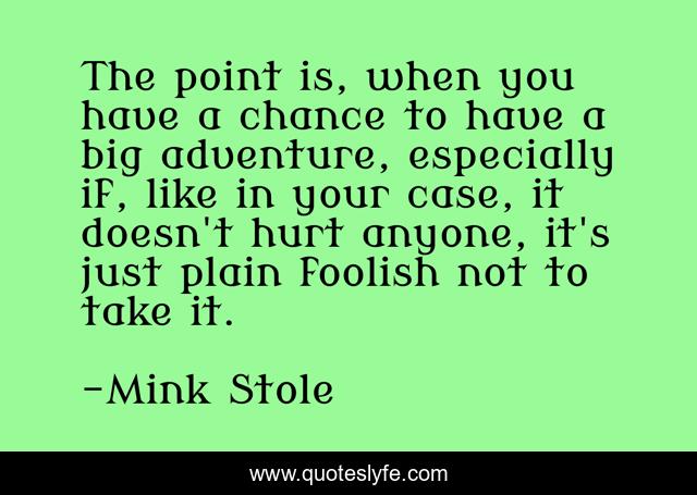 This page presents the quote "The point is, when you have a chance to have a big adventure, especially if, like in your case, it doesn't hurt anyone, it's just plain foolish not to take it.". Author of this quote is Mink Stole. This quote is about adventure, hurt,.